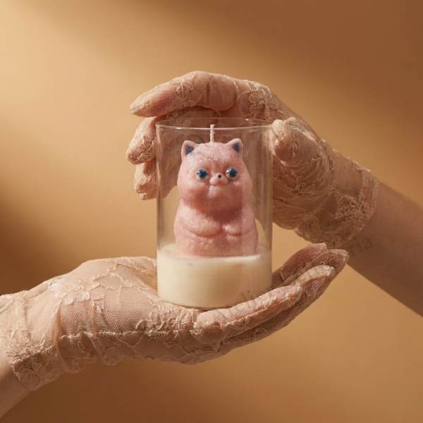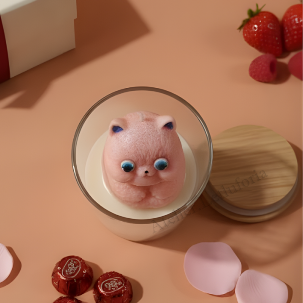 Encased within a clear cylindrical glass vessel, a softly sculpted pink kitty emerges from a creamy wax base — preserved like a collectible art object. The transparent jar enhances the dimensional beauty of the design, allowing light to pass through and highlight every contour, shimmer, and detail. Topped with a natural wooden lid, it feels modern, clean, and thoughtfully curated.